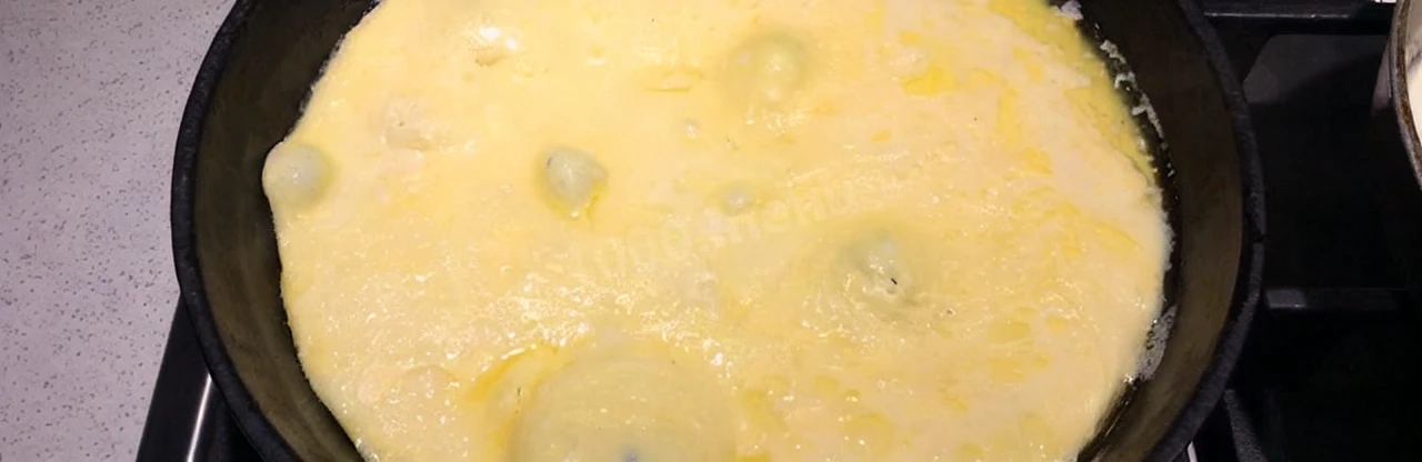 - Налейте порцию готовой массы на нагретую поверхность так, чтобы она равномерно покрыла всю её площадь. Сразу же уменьшите температуру огня до минимальной. Дайте блюду прогреться примерно три минуты, после чего сделайте несколько надрезов снизу ножом, как видно на видео. Так вы сможете контролировать процесс жарки яичницы и убедиться, что середина полностью прожарена. Для получения красивого золотистого цвета переверните продукт уже готовую сторону вниз. Через две–три секунды всё должно выглядеть идеально. Накройте крышкой и дайте ему ещё минуту «дойти» прямо на плите. Готовое блюдо лучше всего подавать сразу.