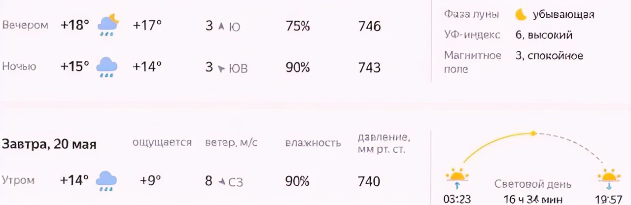 - Вероятность осадков — 30% утром, 65% вечером.